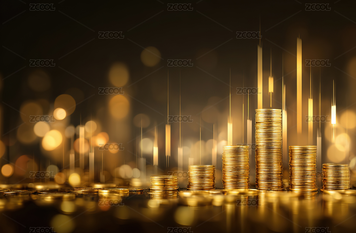 商务金融走势图背景前堆垒的金币