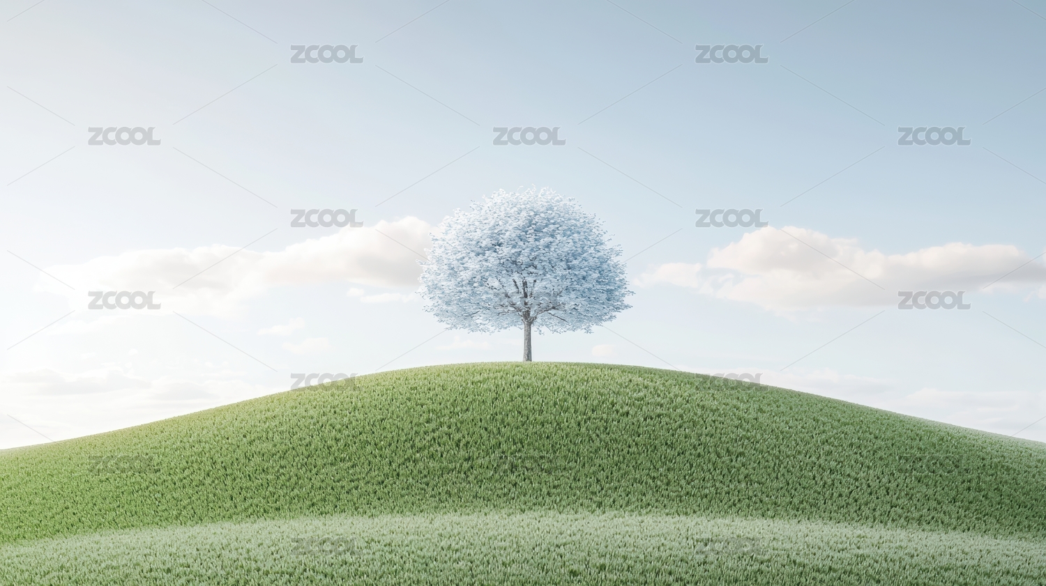 蓝天白云草地上的樱花树