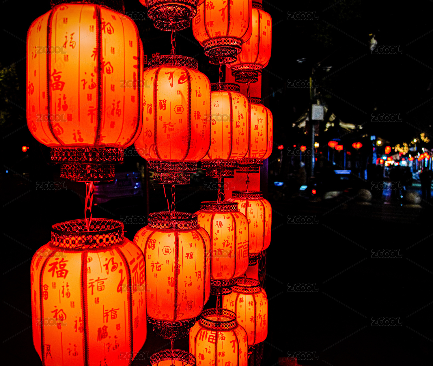 夜晚很多悬挂的中国传统的红色纸灯笼