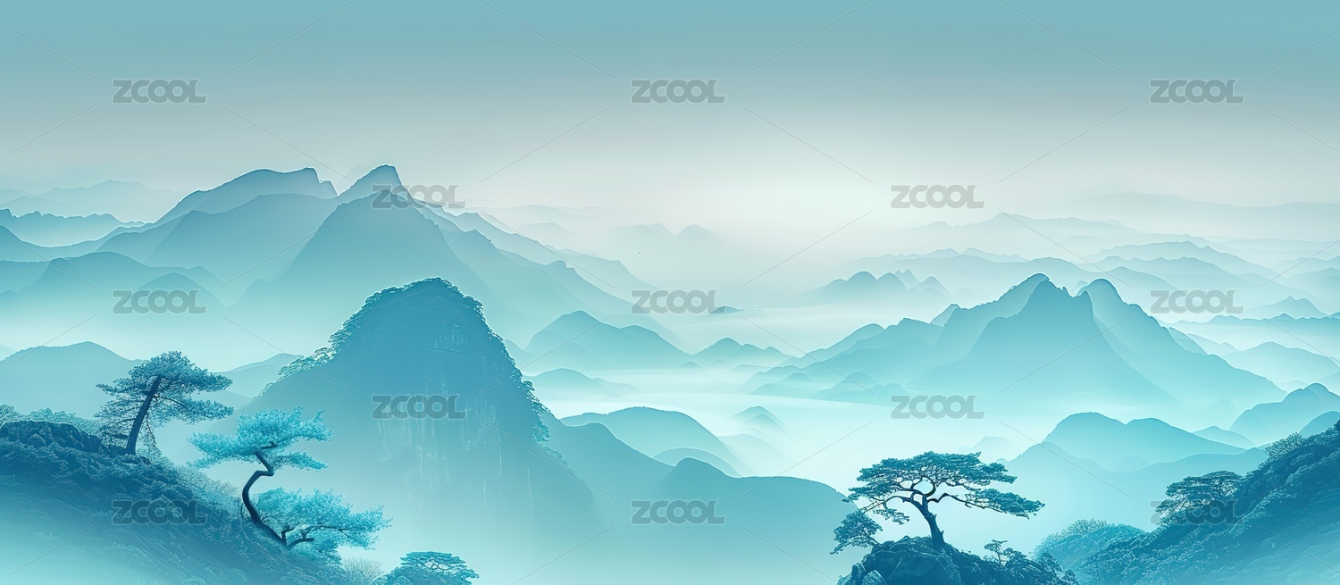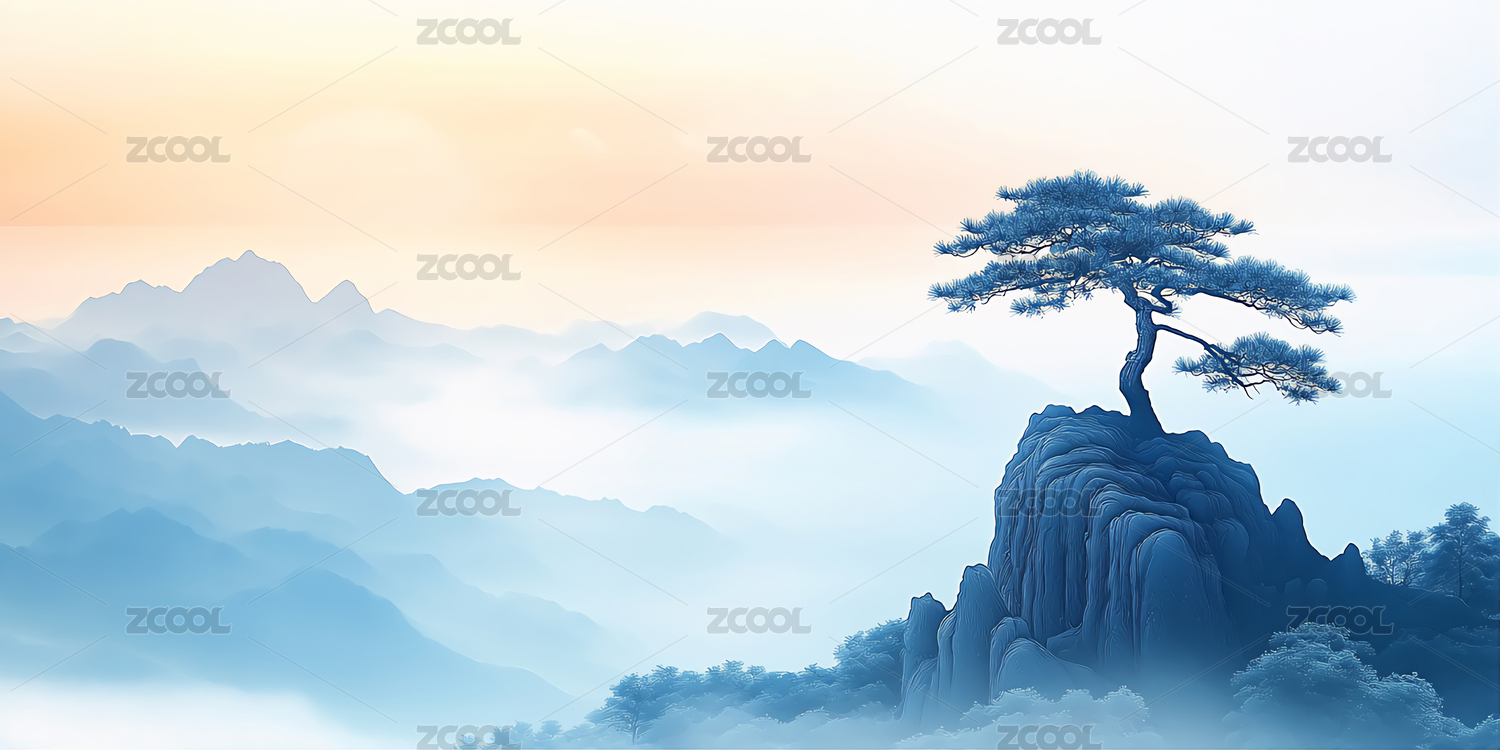 水墨画,江山,风景,迎客松,树木,高山,云雾,天空,背景,插画