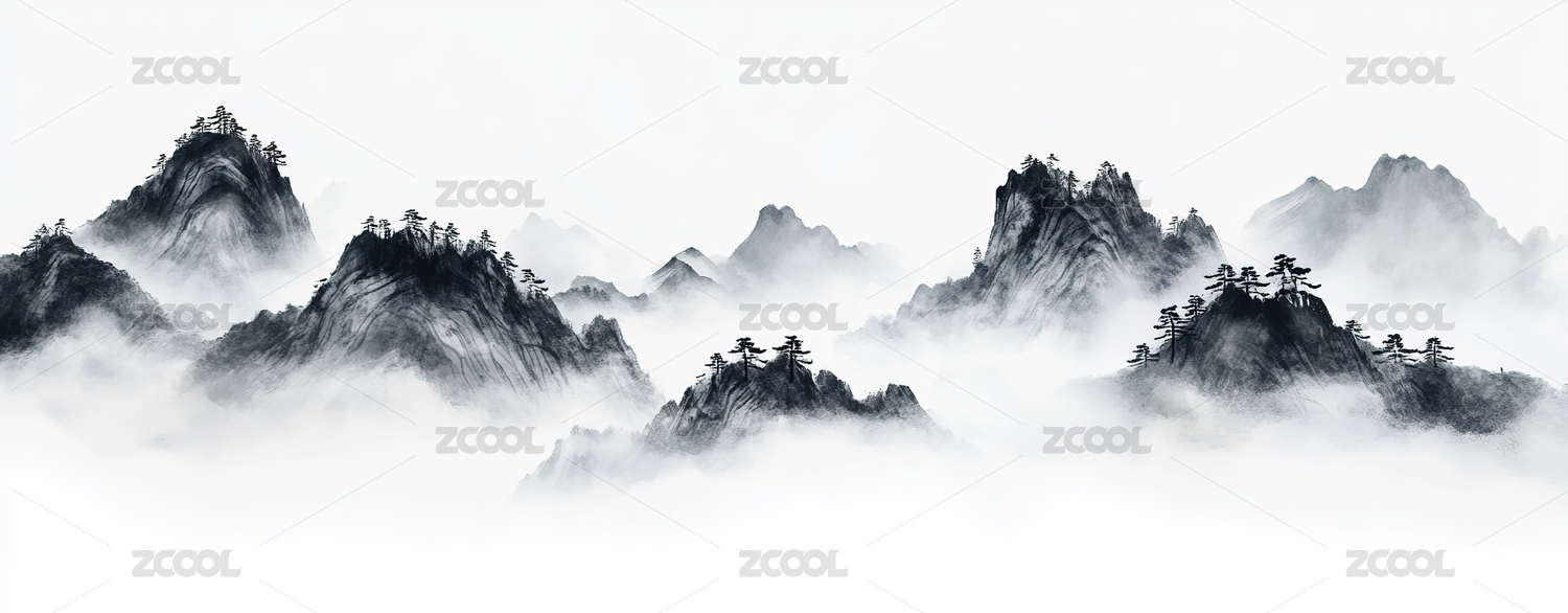 雾中水墨山树的细腻笔触淡蓝色的色调
