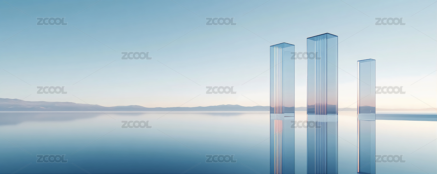 湖面倒影中的三座透明柱体
