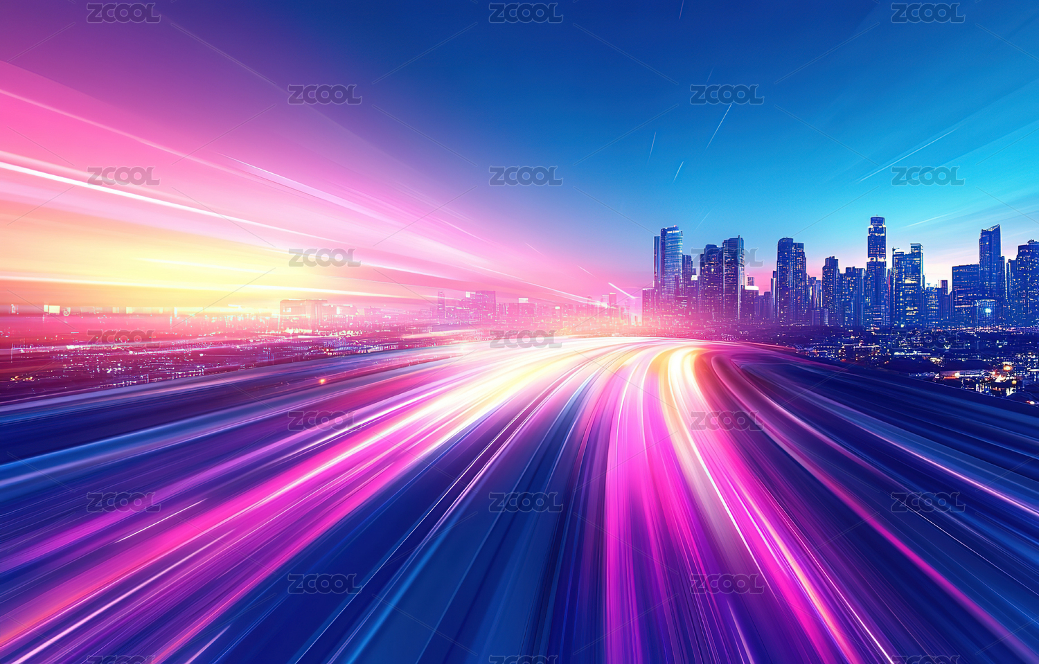 赛博朋克风格城市地平线及速度感公路