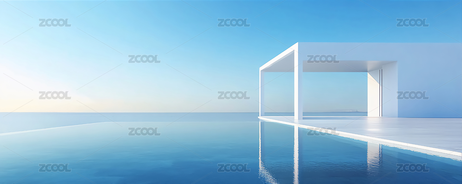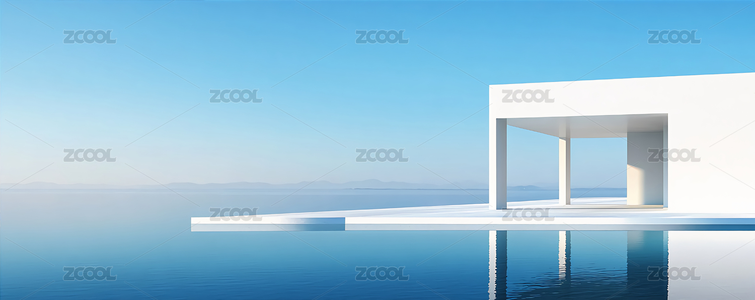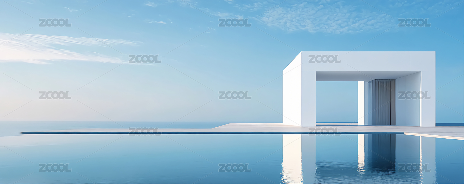 极简,滨水,建筑,海景,反射,背景,蓝天,云彩,风景,户外