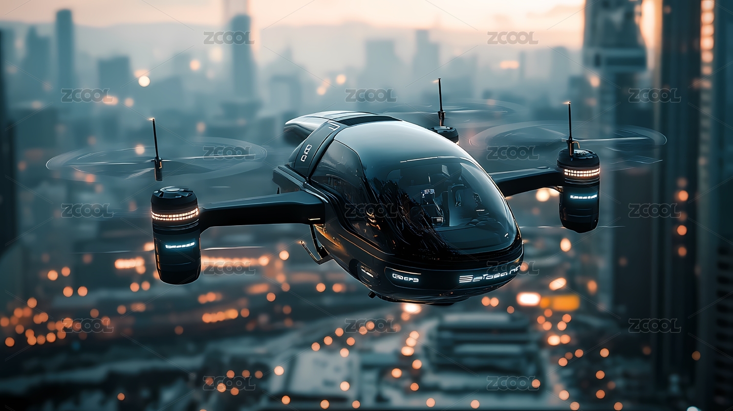 科技空中带旋翼的自动驾驶飞行汽车赛博插画