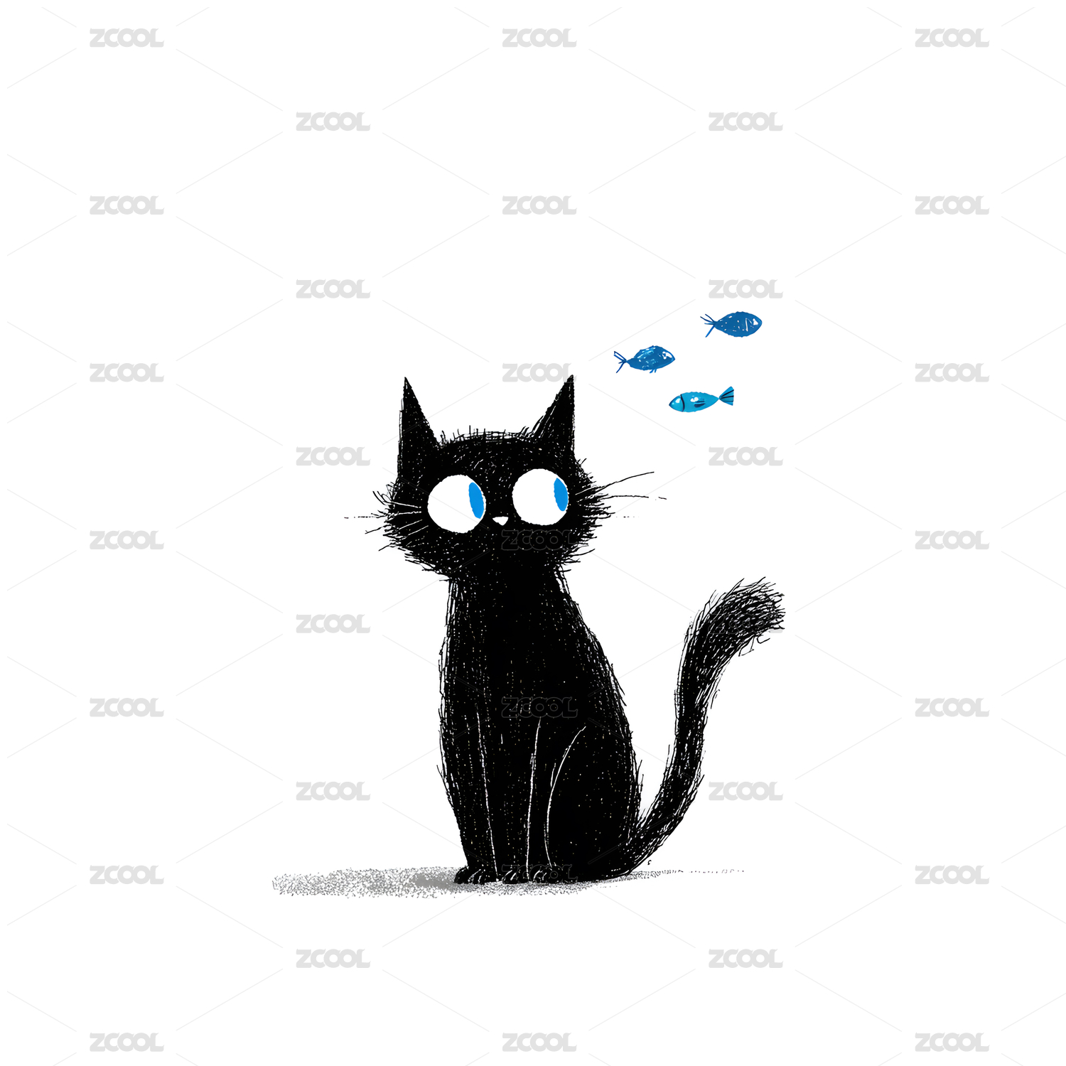 黑色拟人小猫形象蜡笔画
