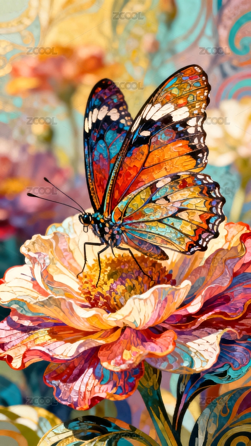 两只蓝蝶栖息在色彩斑斓的粉花上