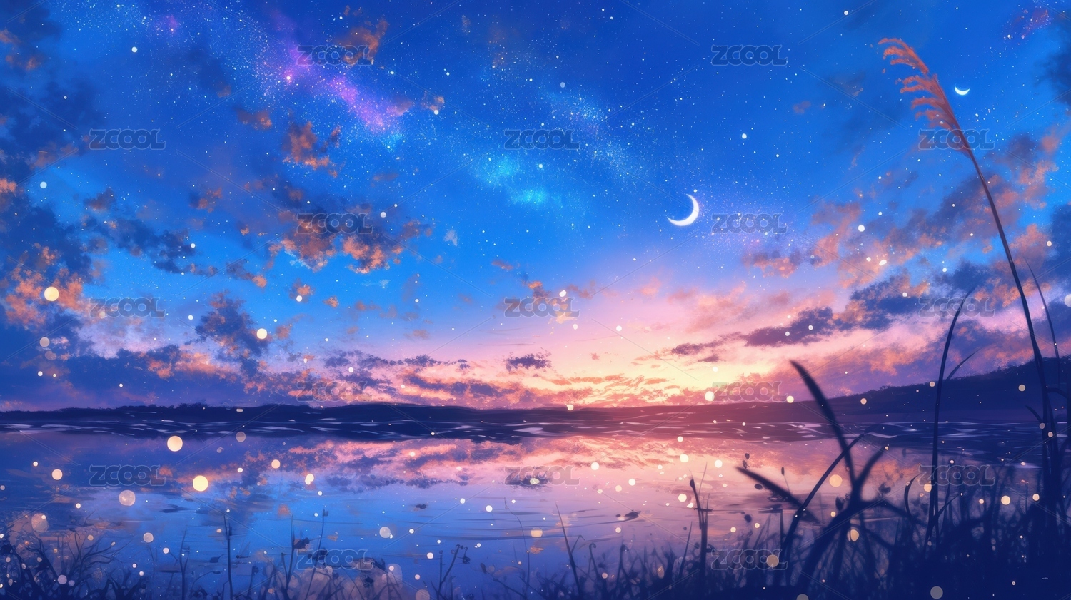 唯美夏季夜晚星光闪耀的治愈插画壁纸