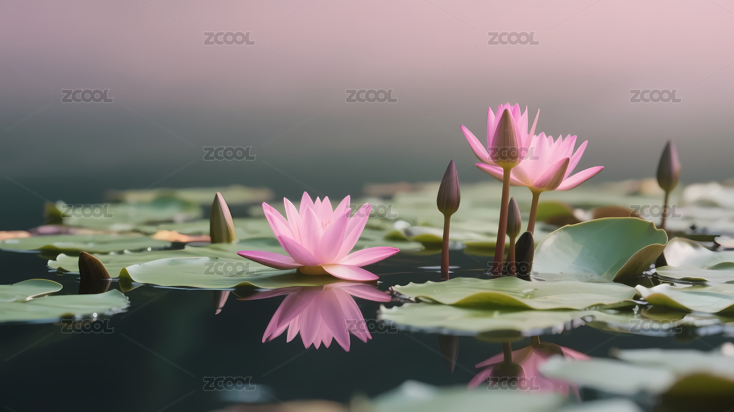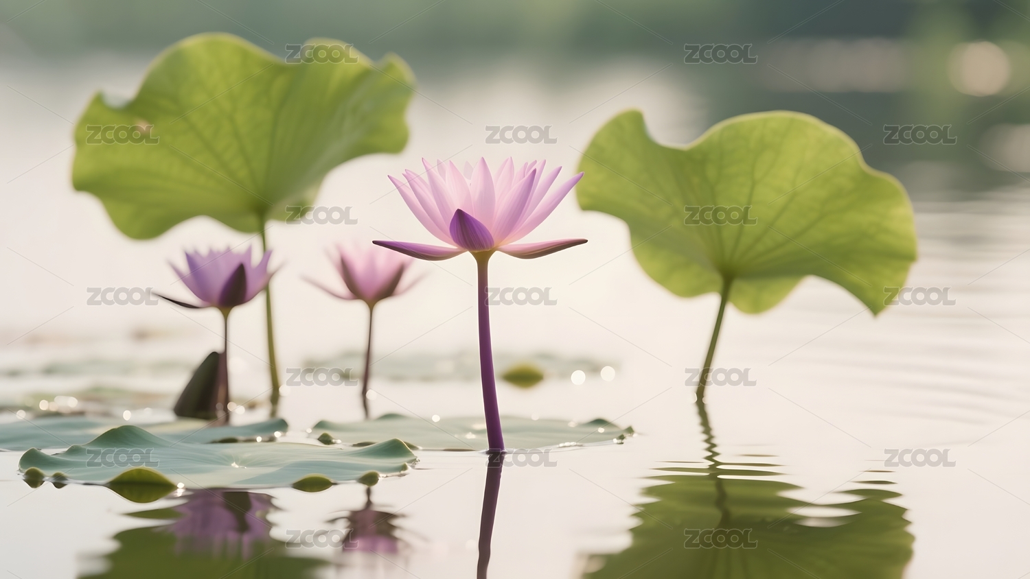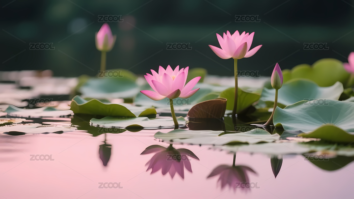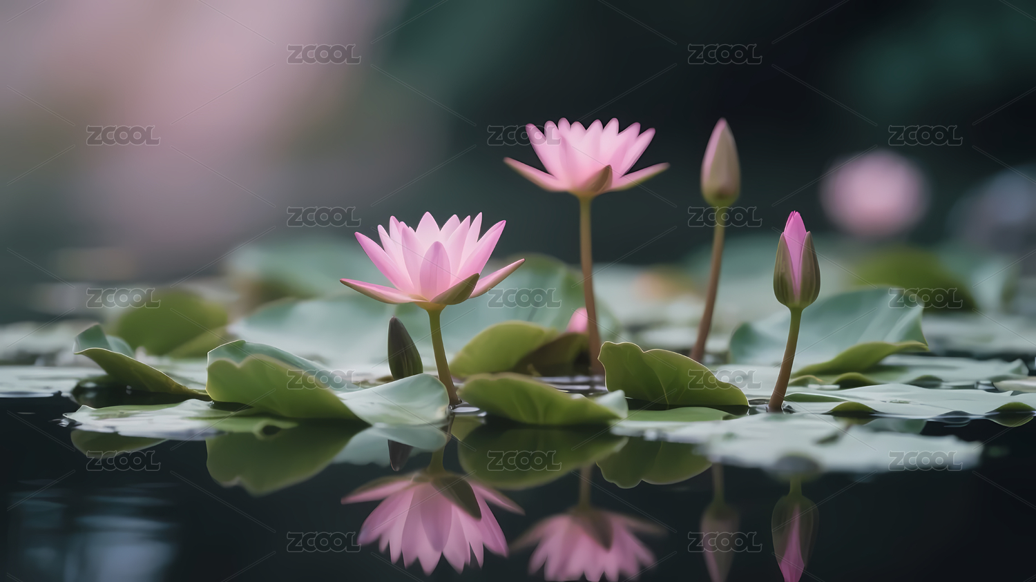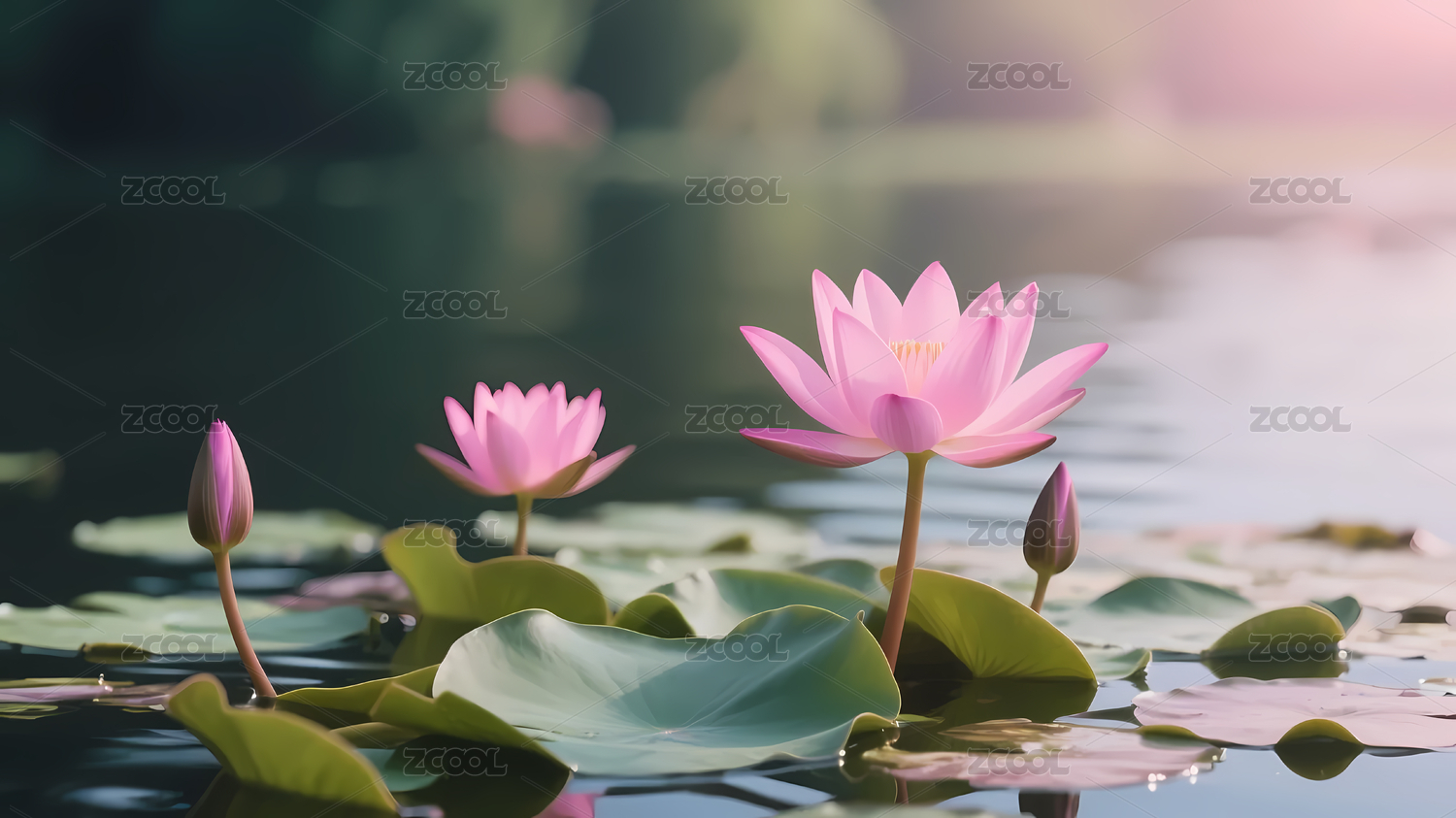 蓝色,粉色,背景,柔和,绿色,莲花,荷叶,水面,花蕾,漂浮
