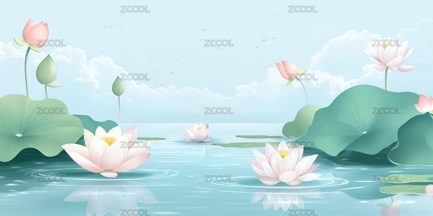 蓝天白云池塘中荷花盛开着-唯美夏季插画
