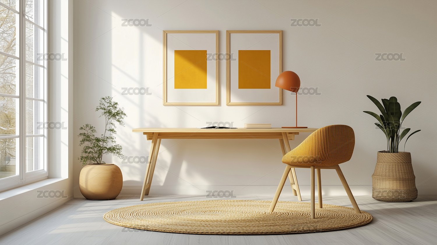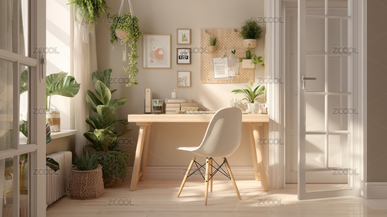 空间,工作,书桌,木质,椅子,皮革,墙面,白色,植物,装饰