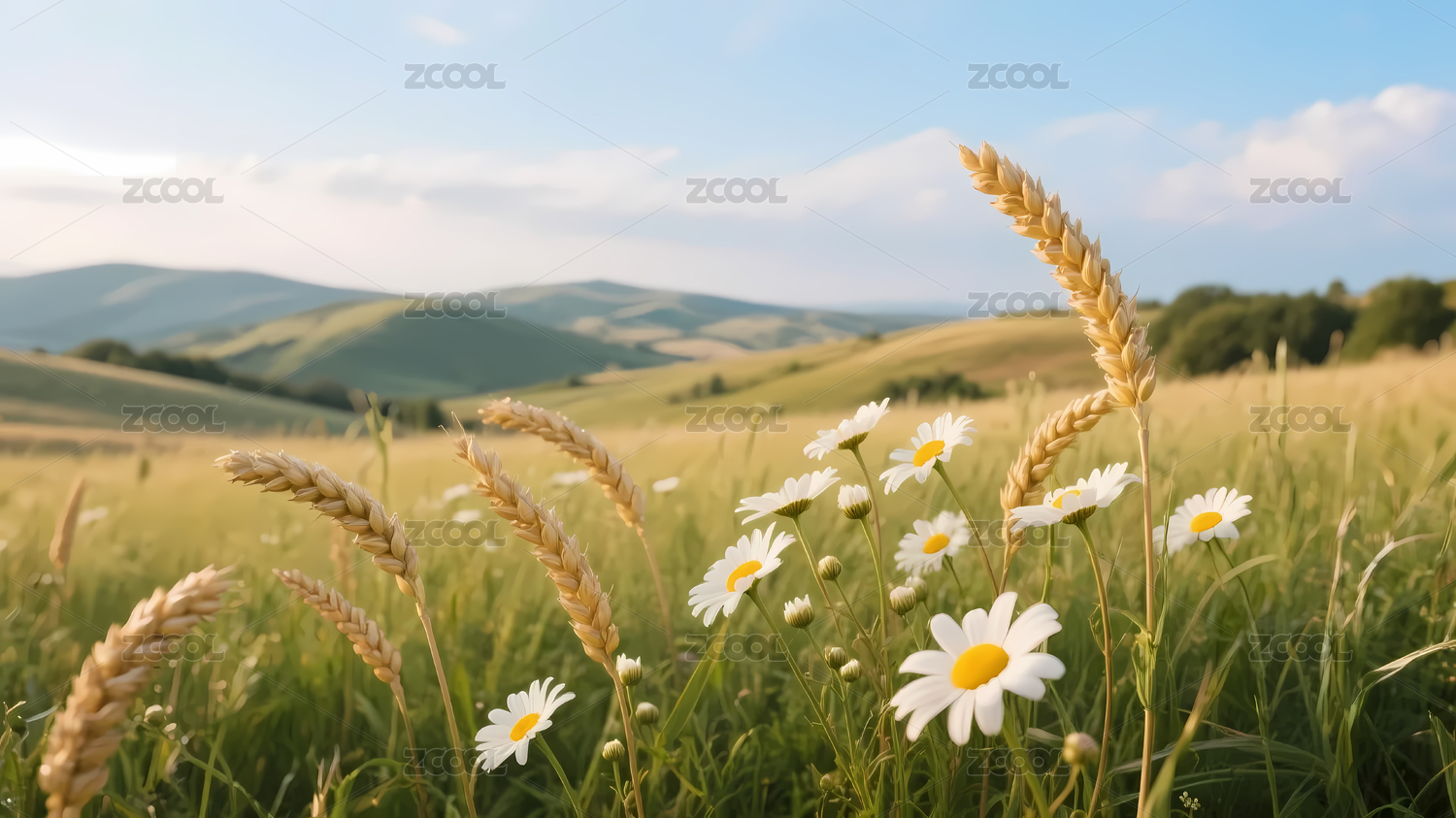 明亮麦穗雏菊山丘