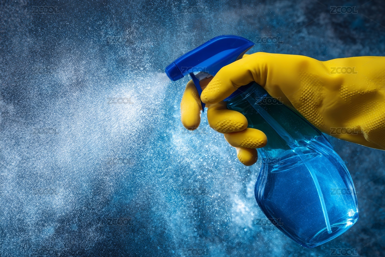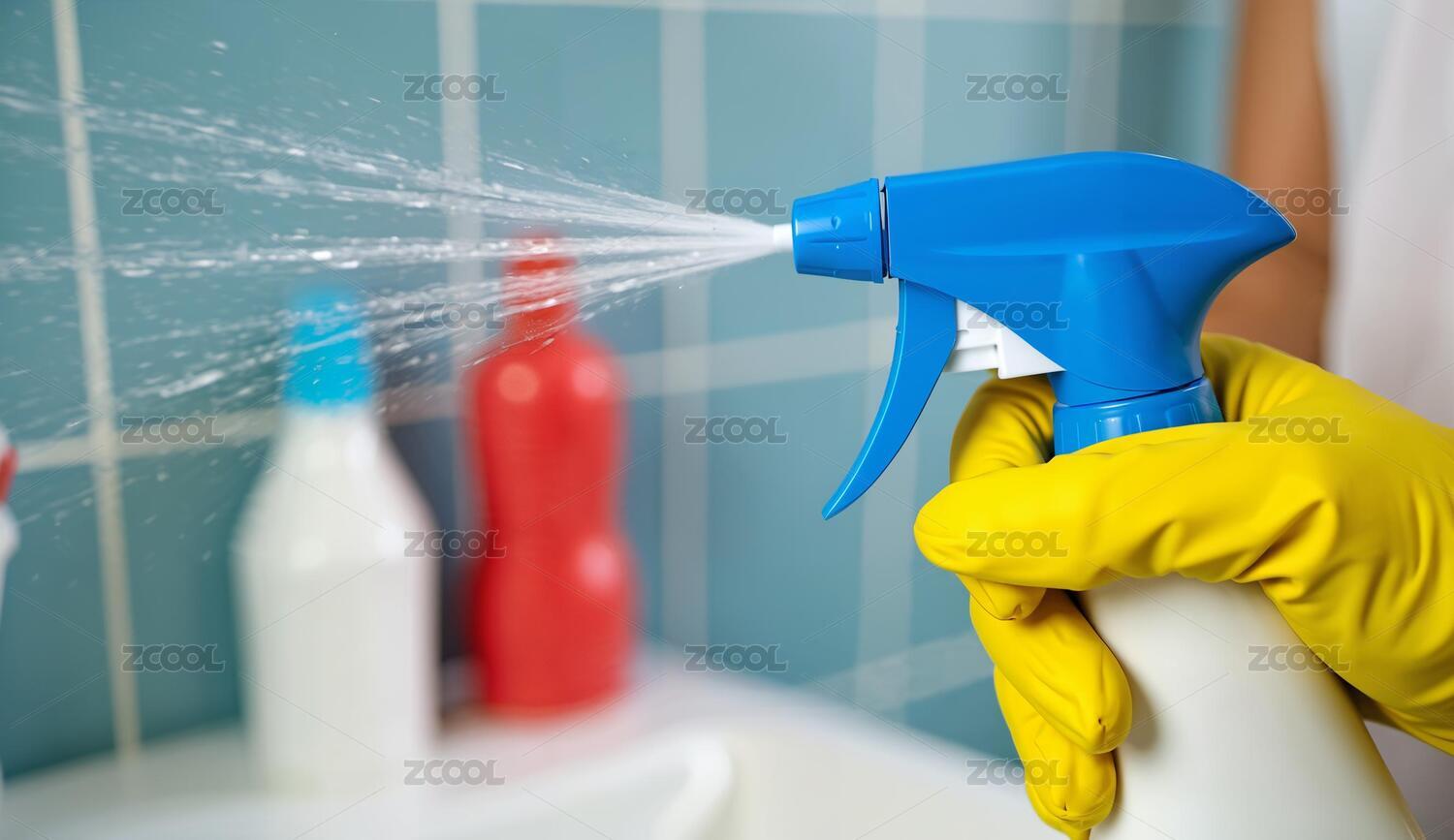 黄色手套拿着蓝色喷雾瓶