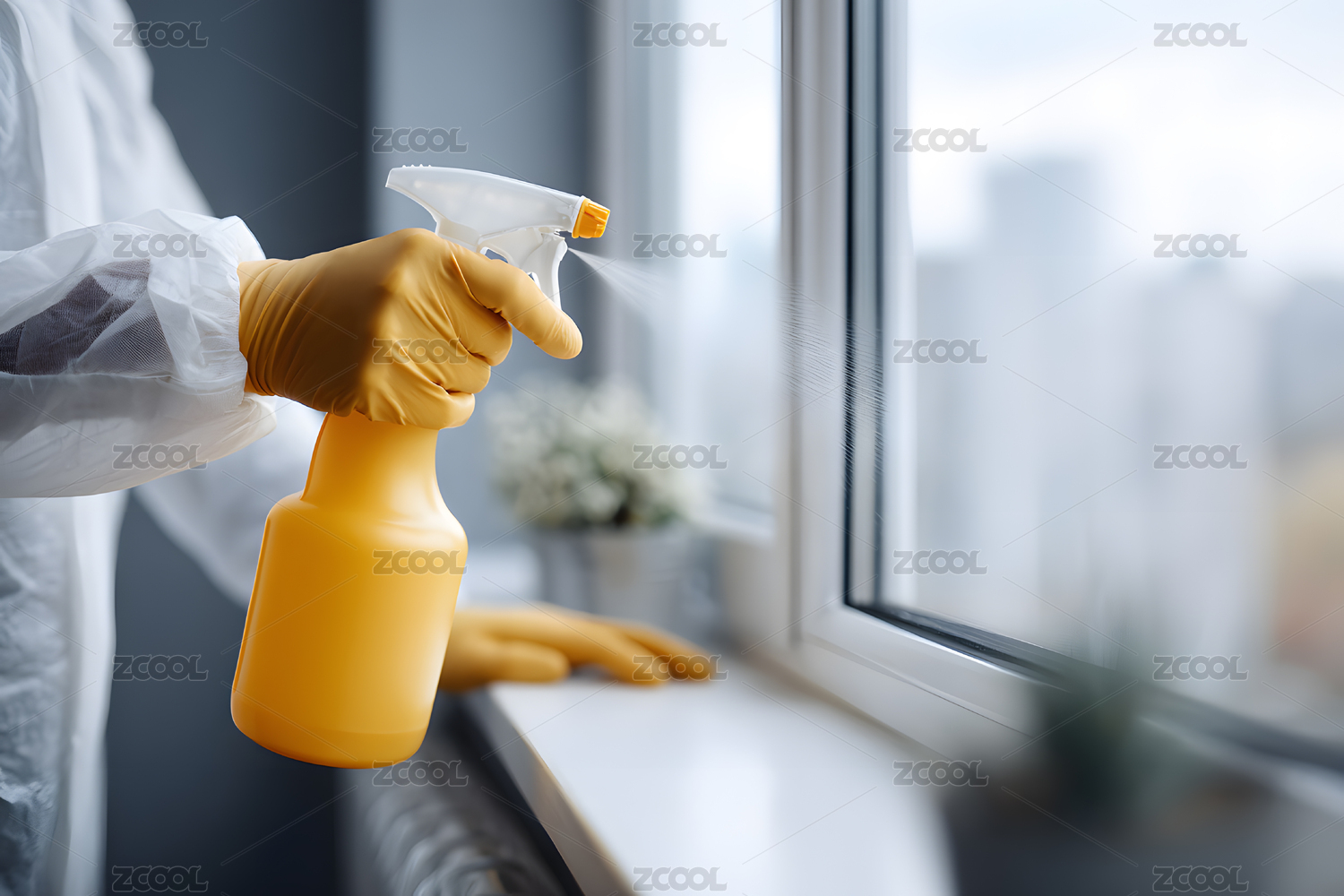 黄手套握绿喷瓶