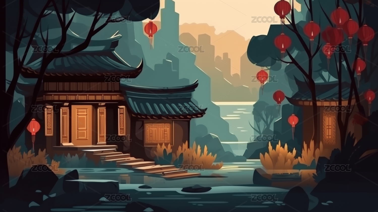 建筑,庭院,灯笼,树,景观,风格,传统,寺庙,山,东方