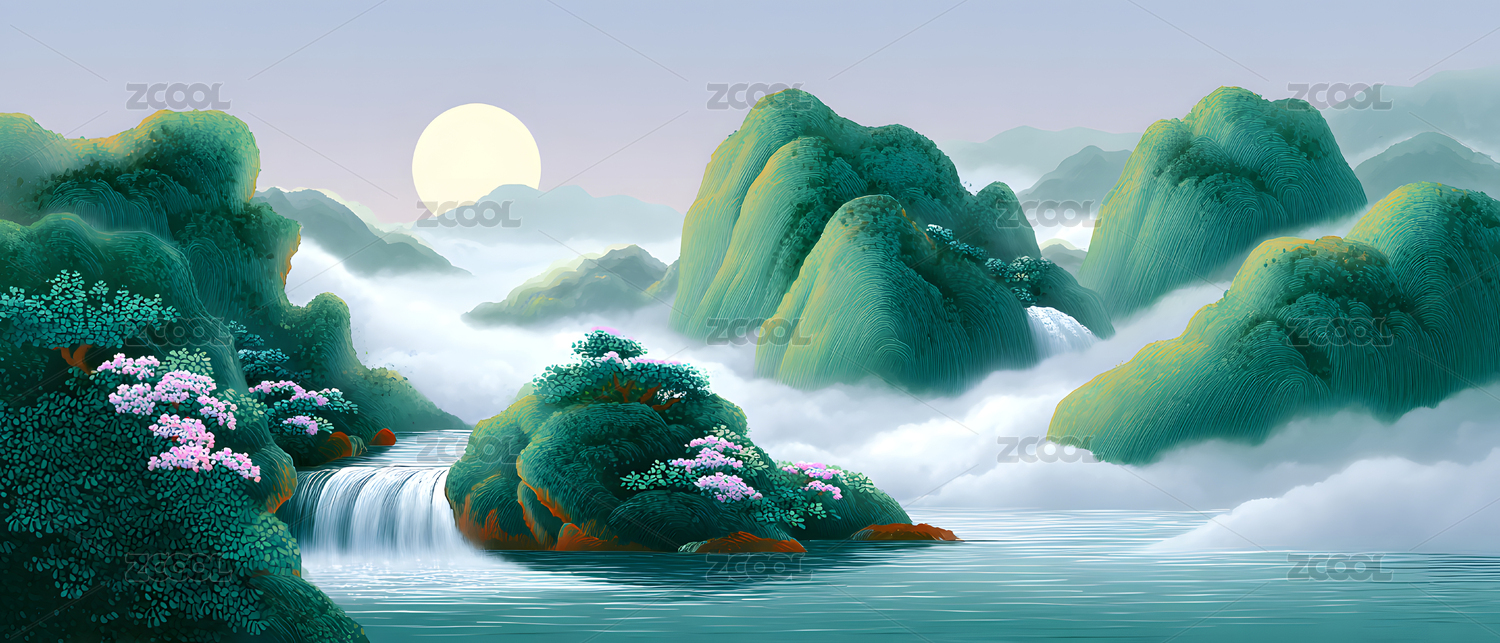 新国风古风国潮青绿山水画水墨传统背景壁纸