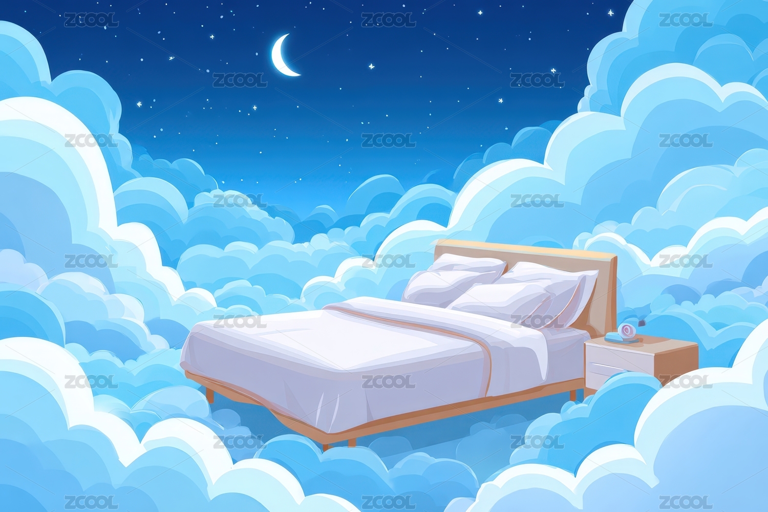背景,白色,夜空,粉色,星星,床,被子,枕头,弯月,白云