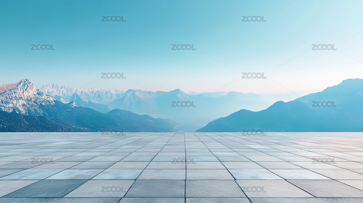 蓝天下的雪山和广场地面