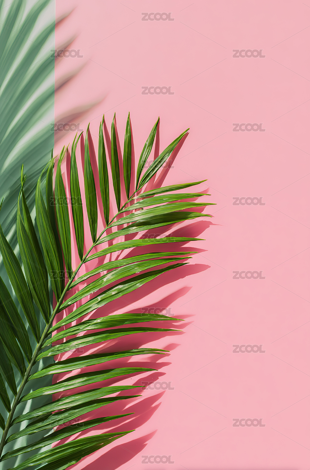 粉红色背景下绿叶棕榈树枝的明媚阳光