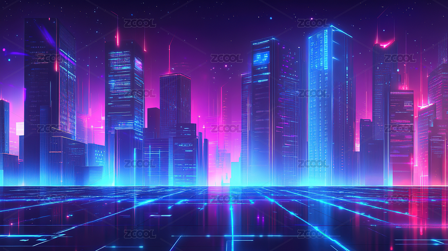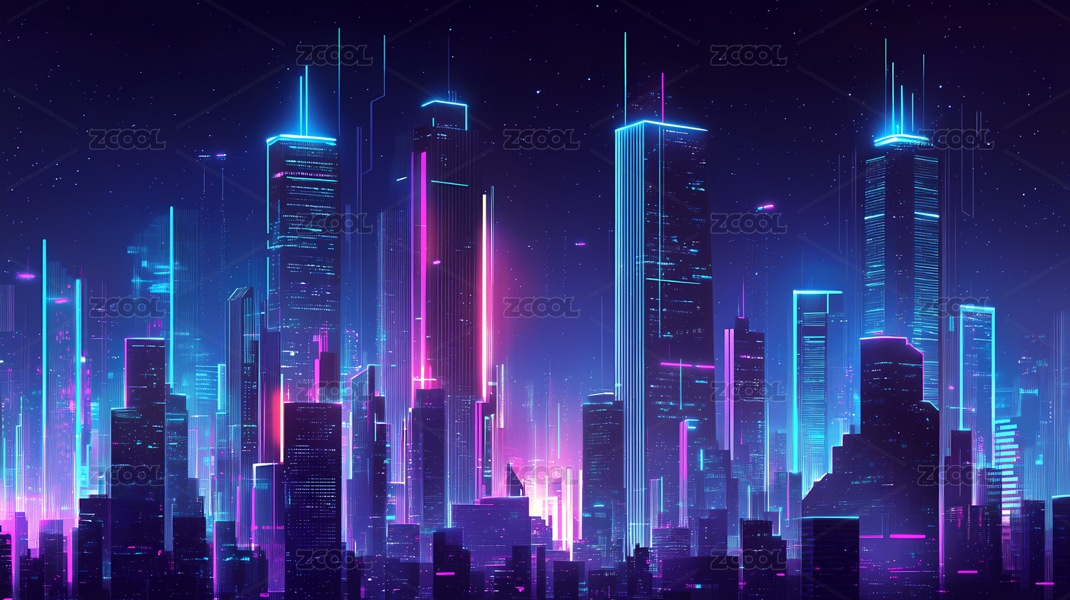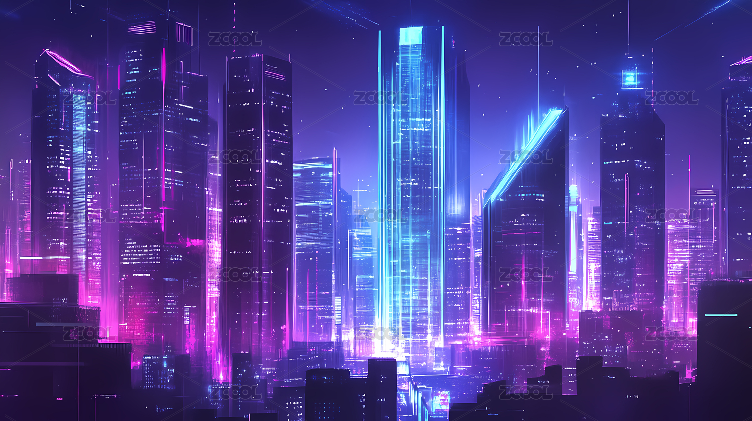 紫色,蓝色,霓虹灯,深色,氛围,科技,未来,夜空,高楼,建筑