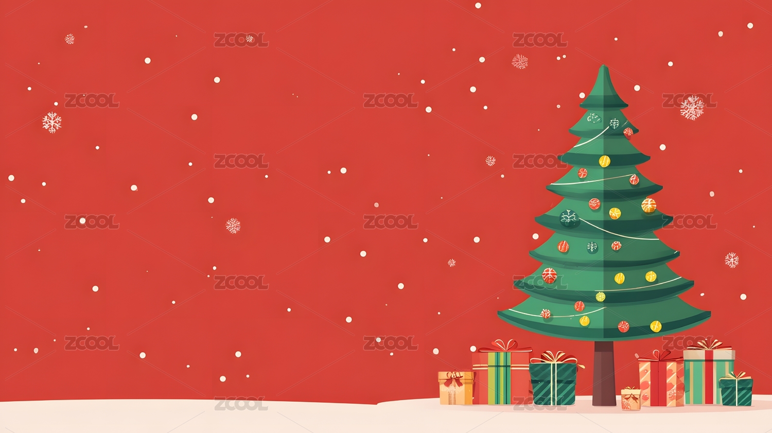圣诞树与礼物在红色的背景下庆祝节日气氛