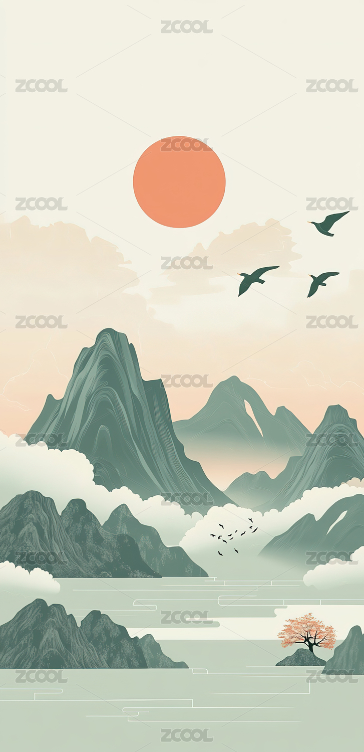 暖调山峦红日图