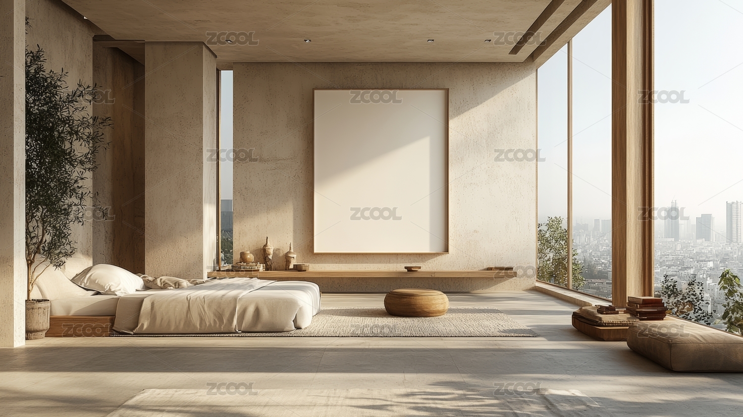 卧室,侘寂,米色,橡木,纹理,极简,床铺,灯光,墙面,装饰