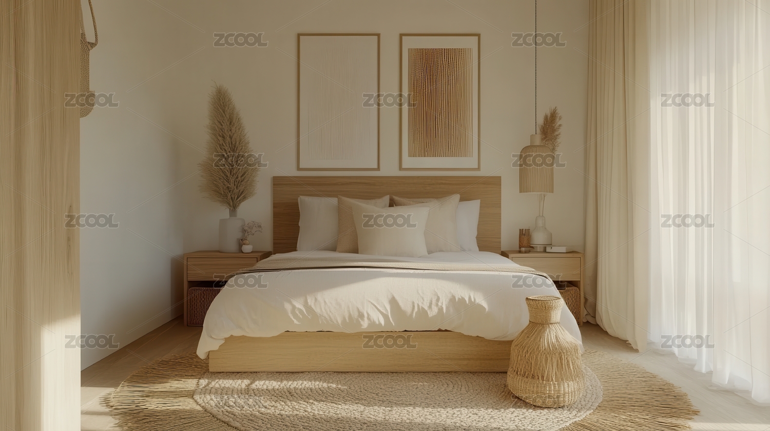卧室,侘寂,米色,橡木,纹理,极简,床铺,灯光,墙面,装饰