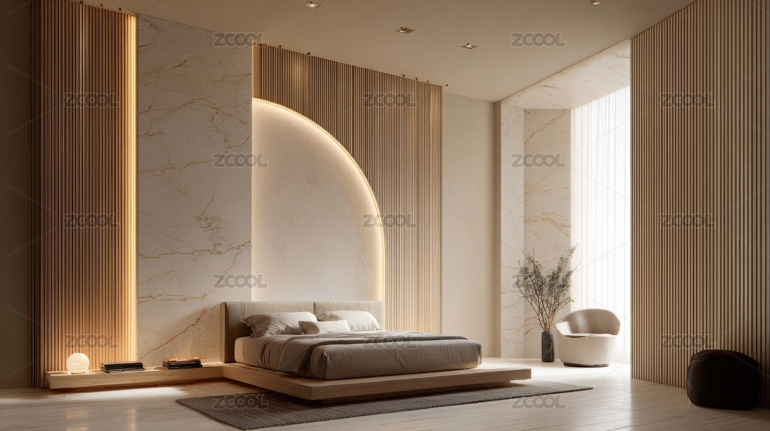卧室,侘寂,米色,橡木,纹理,极简,床铺,灯光,墙面,装饰