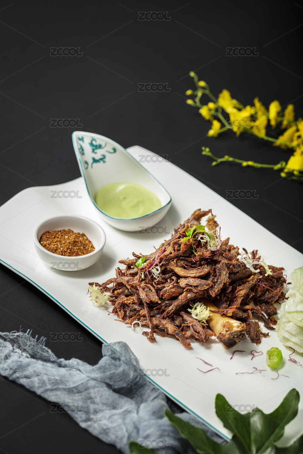 峨嵋手撕驴肉摆放在黑色鹅卵石上