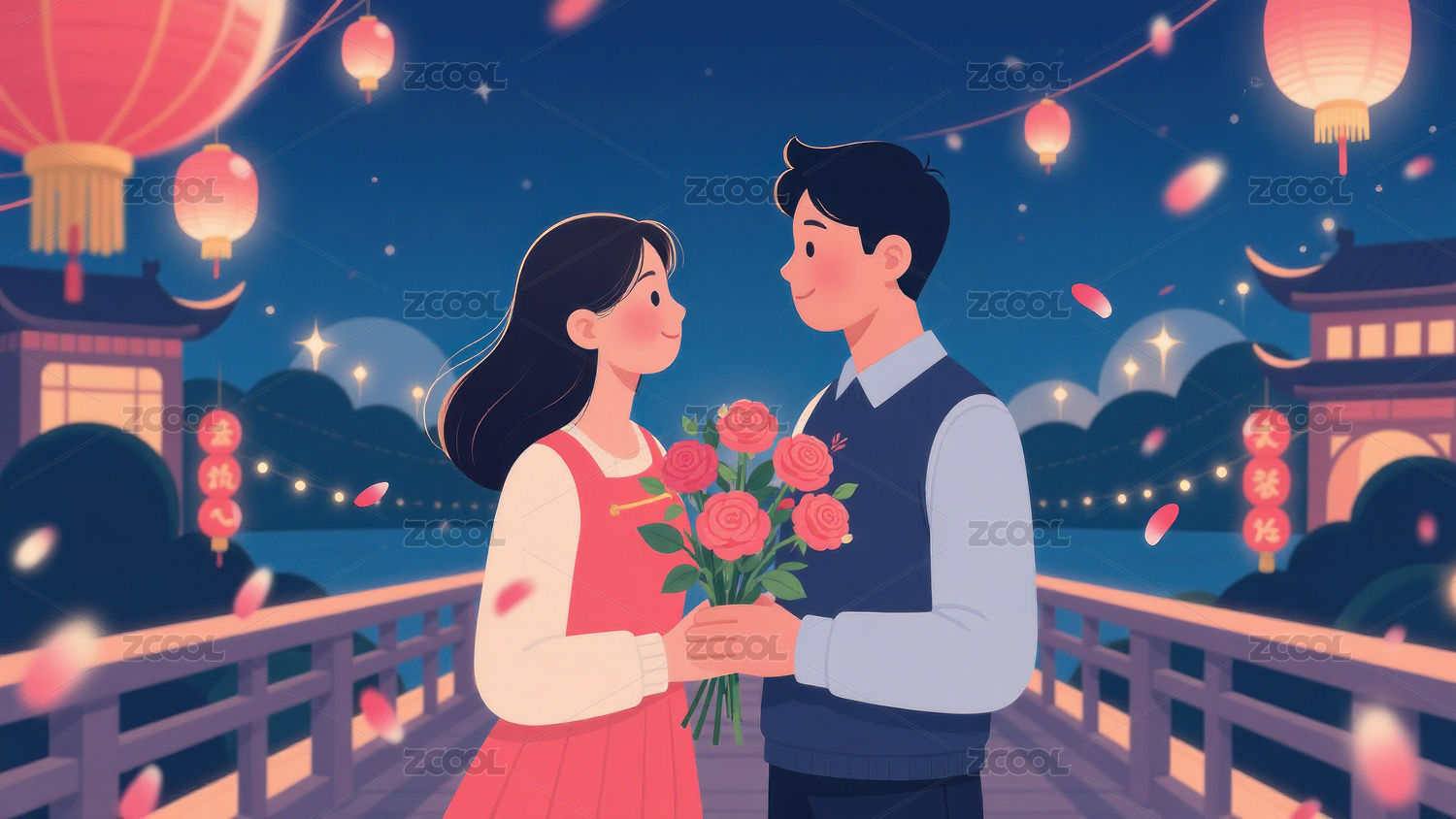 花灯下的浪漫相遇情人节七夕爱情插画