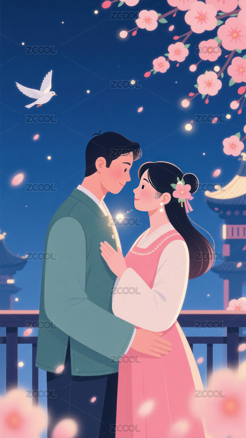 花灯下的浪漫相遇情人节七夕爱情插画