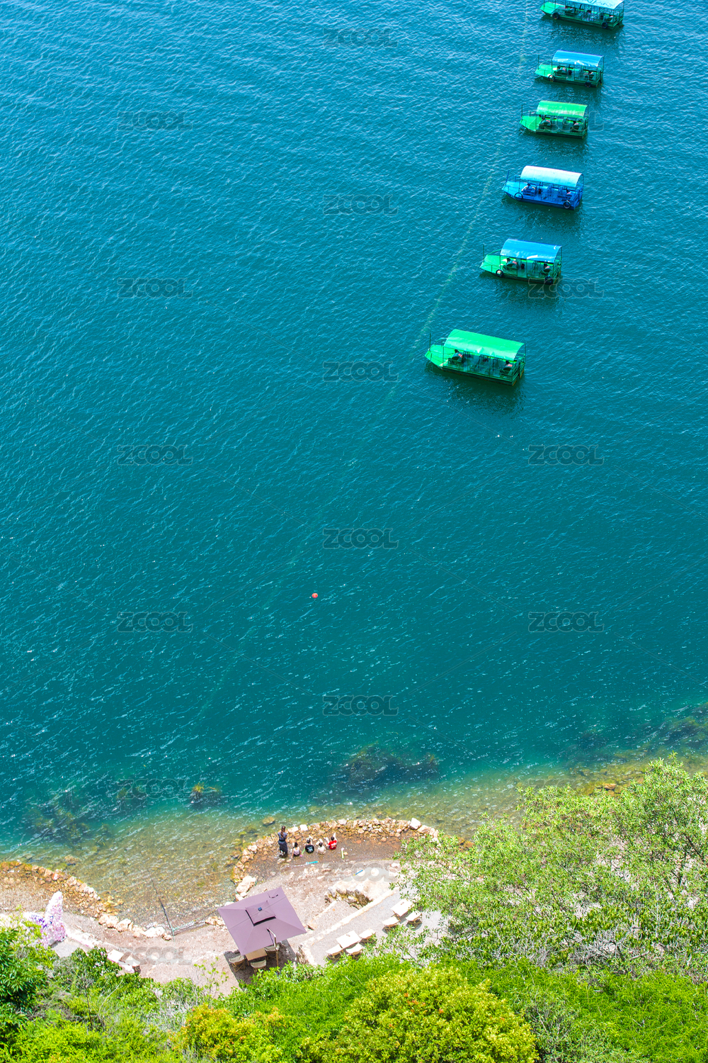 山水,湖水,小船,蓝色小船,植被,自然风光,水上景观,俯瞰视角,风景,航拍视角