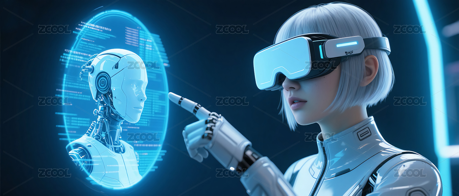 一位穿着时尚虚拟现实眼镜的人形机器人
