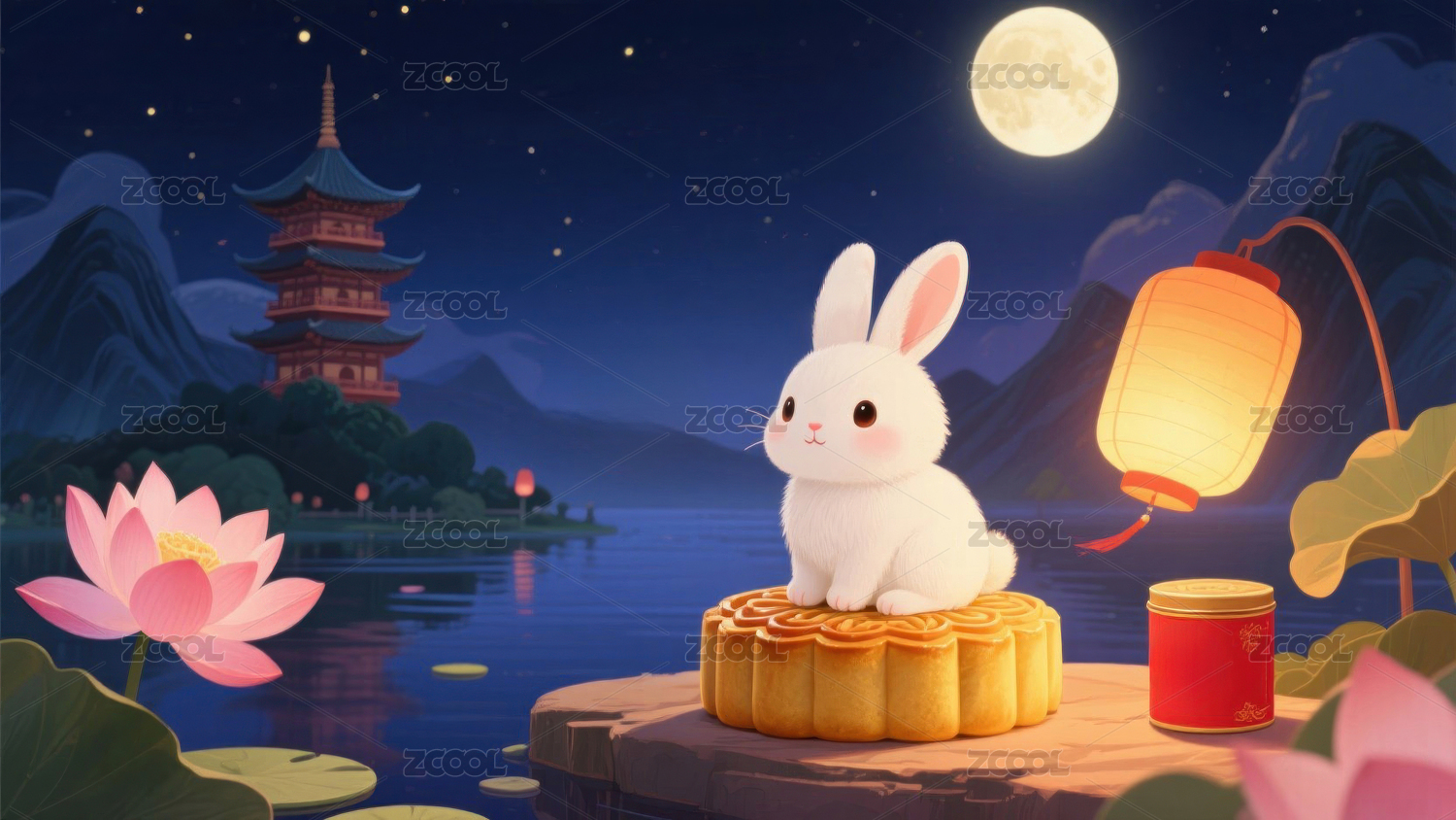 中秋,月夜,玉兔,月饼,满月,湖泊,荷花,宝塔,山峦,夜空