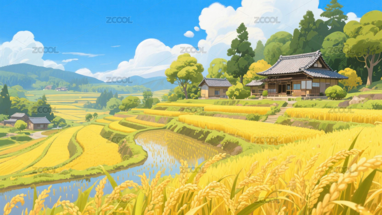 金黄稻田与传统民居构成的乡村美景