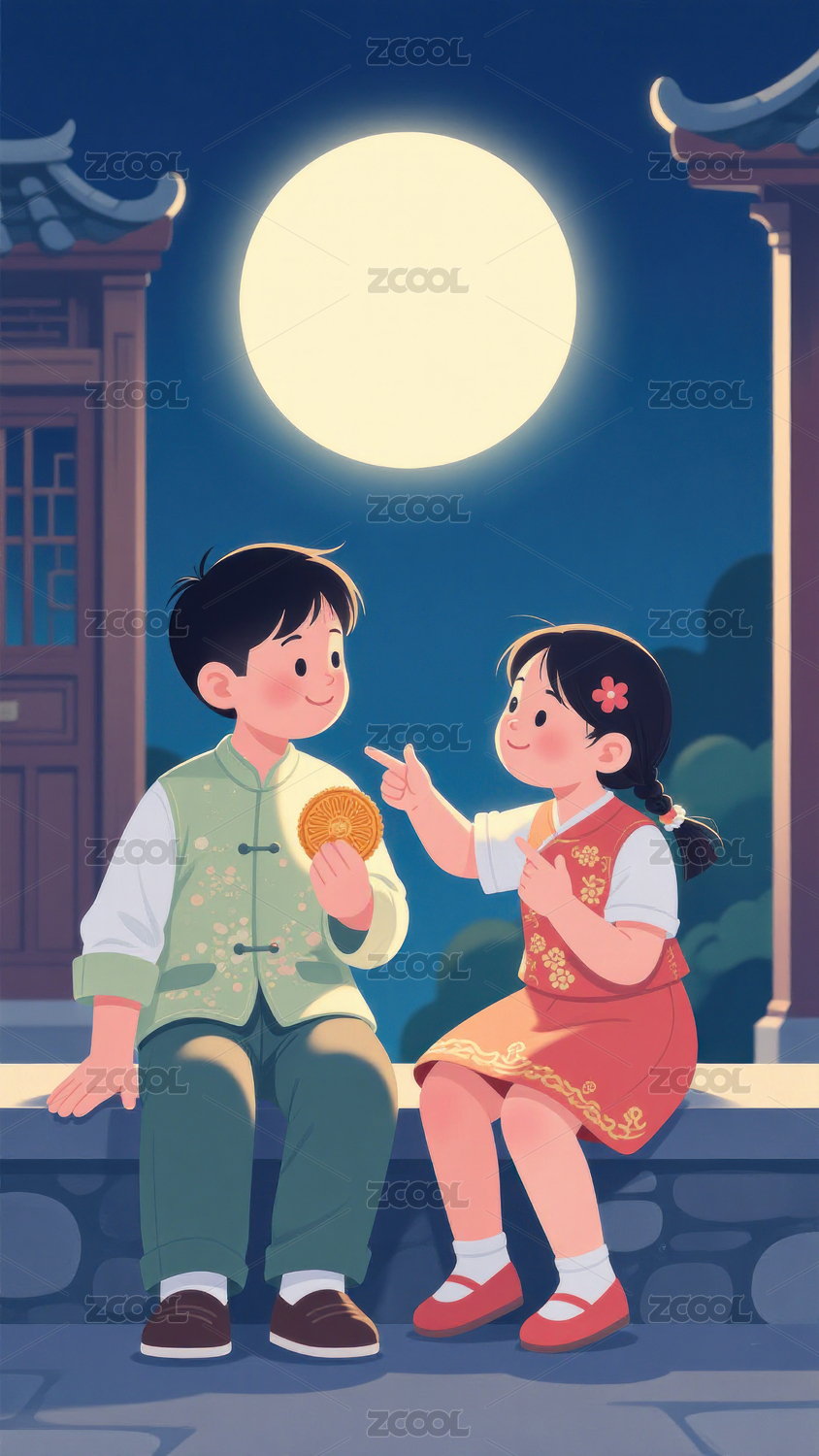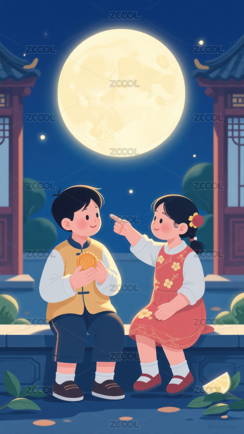 月光下的童年剪影中秋节孩童赏月