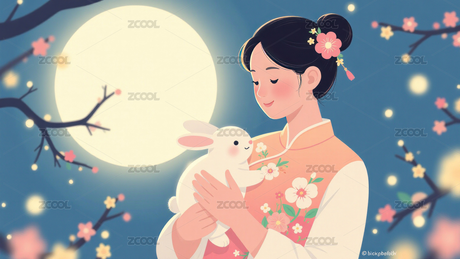 中秋节,嫦娥,玉兔,月亮,团圆,中国风,传统节日,卡通,女孩,兔子