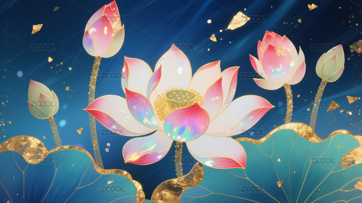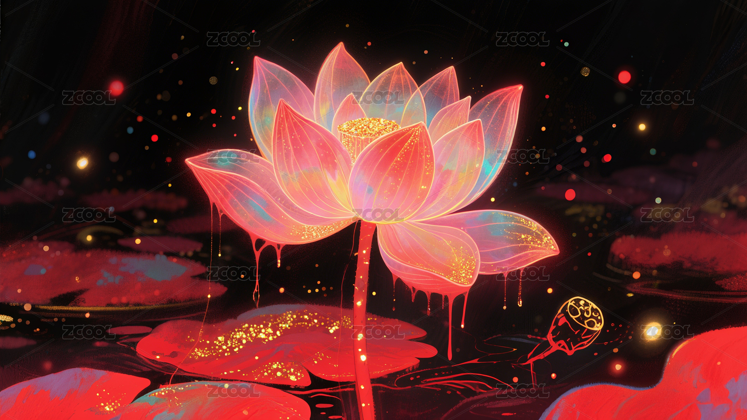 红色,梦幻,半透明,莲花,池塘,工笔画,黑色背景,电商背景,海报