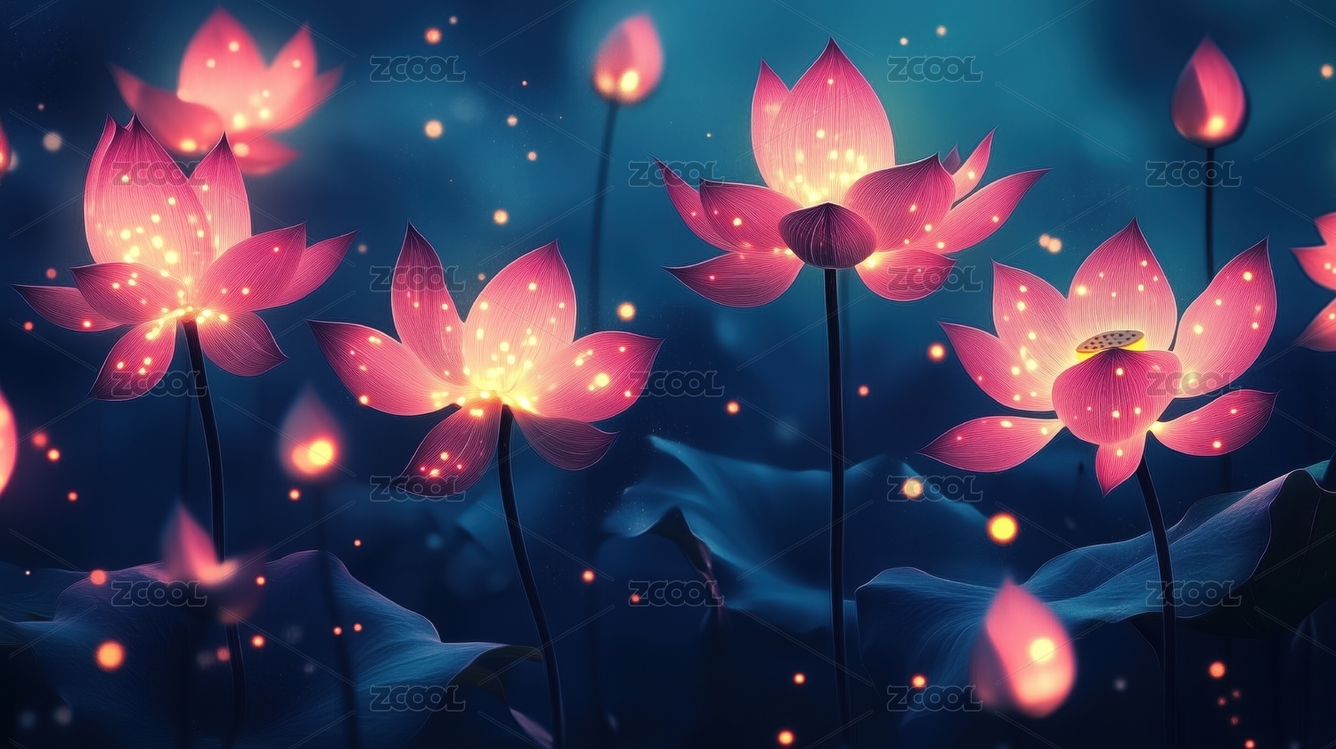 红色,梦幻,半透明,莲花,池塘,工笔画,黑色背景,电商背景,海报