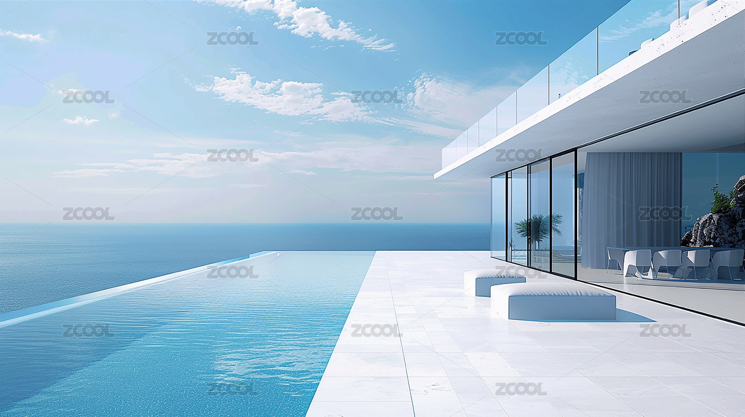 现代建筑,泳池,海景,玻璃幕墙,休闲躺椅,悬崖边,户外空间,宁静,奢华,度假