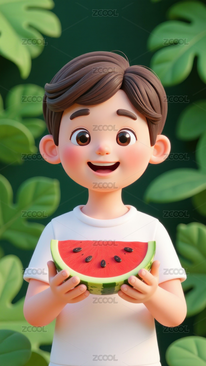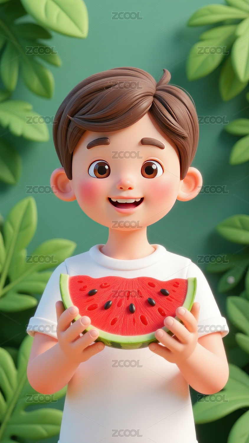 一个亚洲孩子开心抱着西瓜3d卡通插画