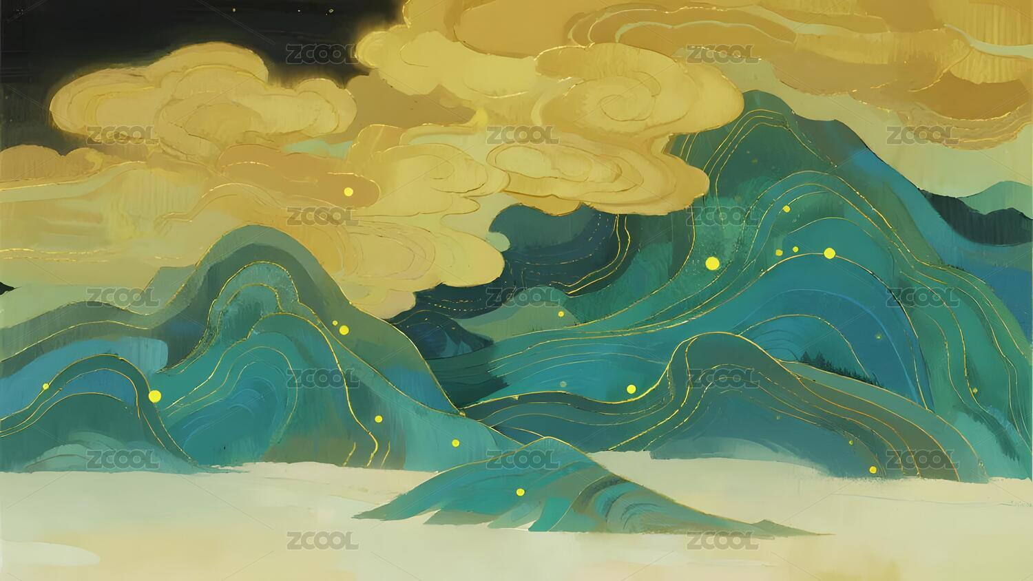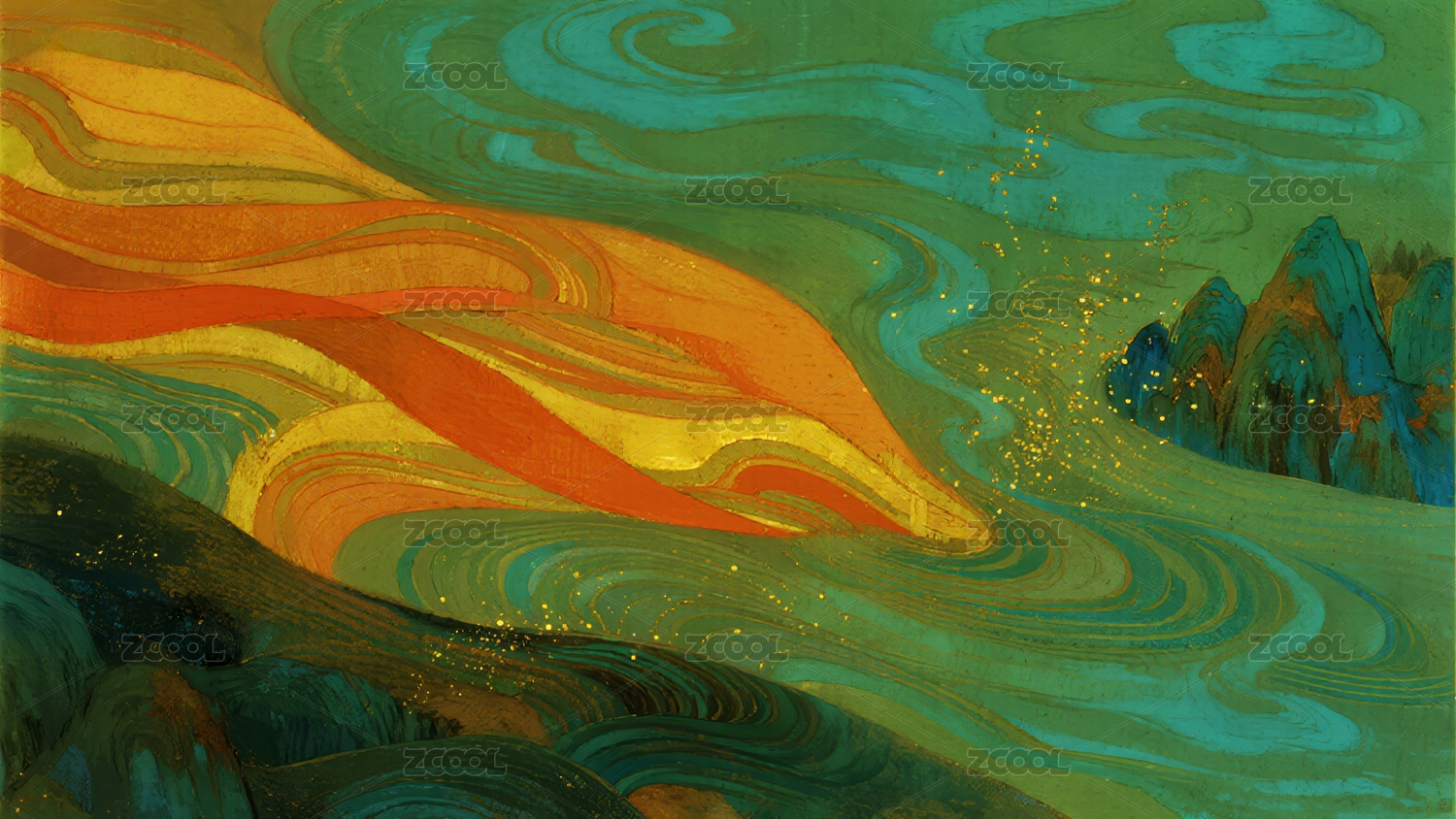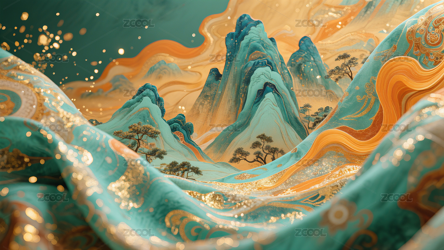 敦煌风格,金箔岩彩,青绿色,立体,丝绸,橙黄色,金色颗粒,山水画,电商背景