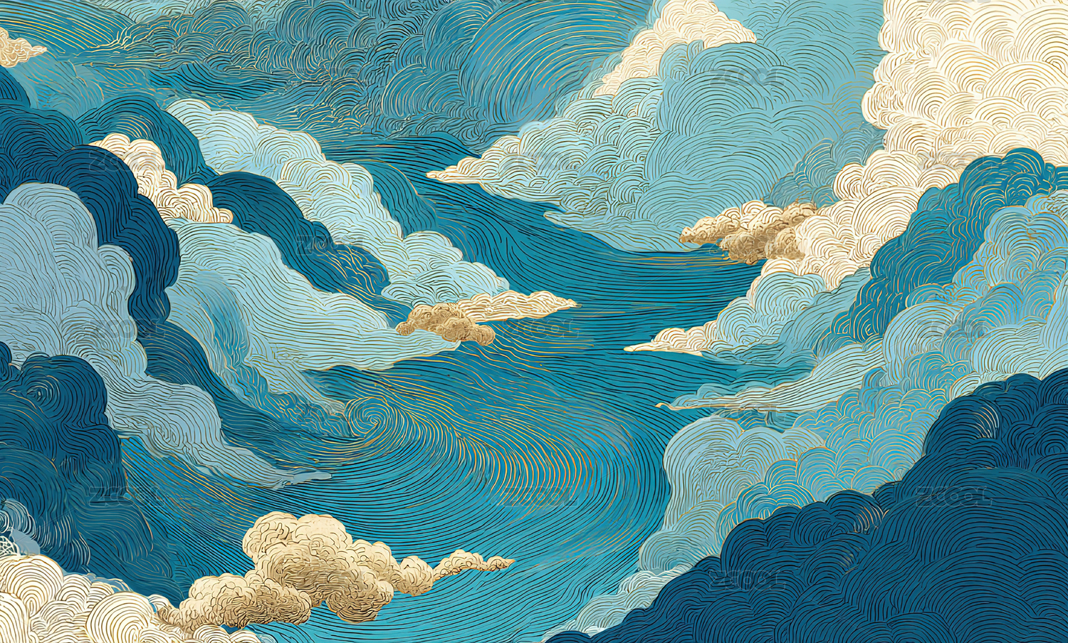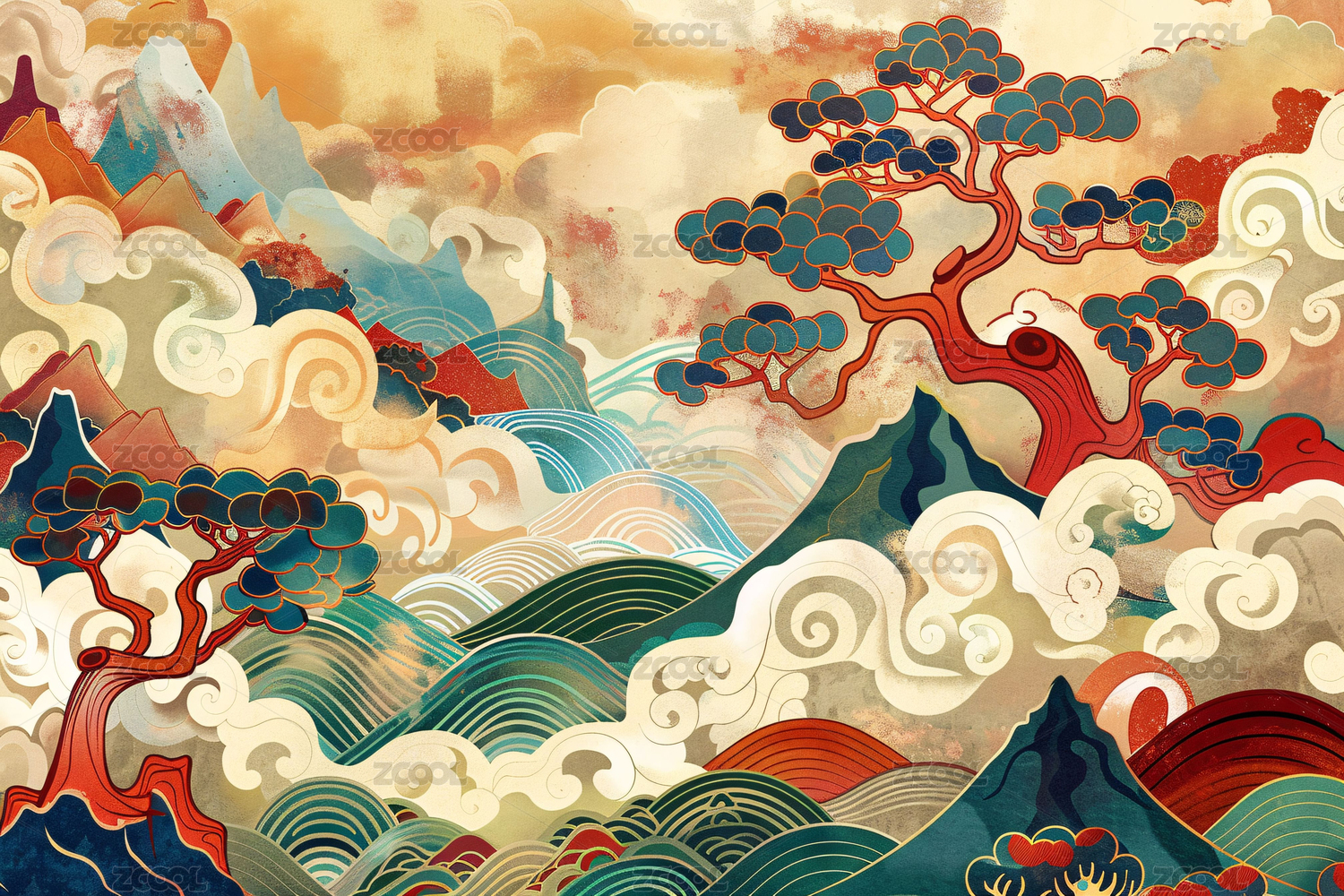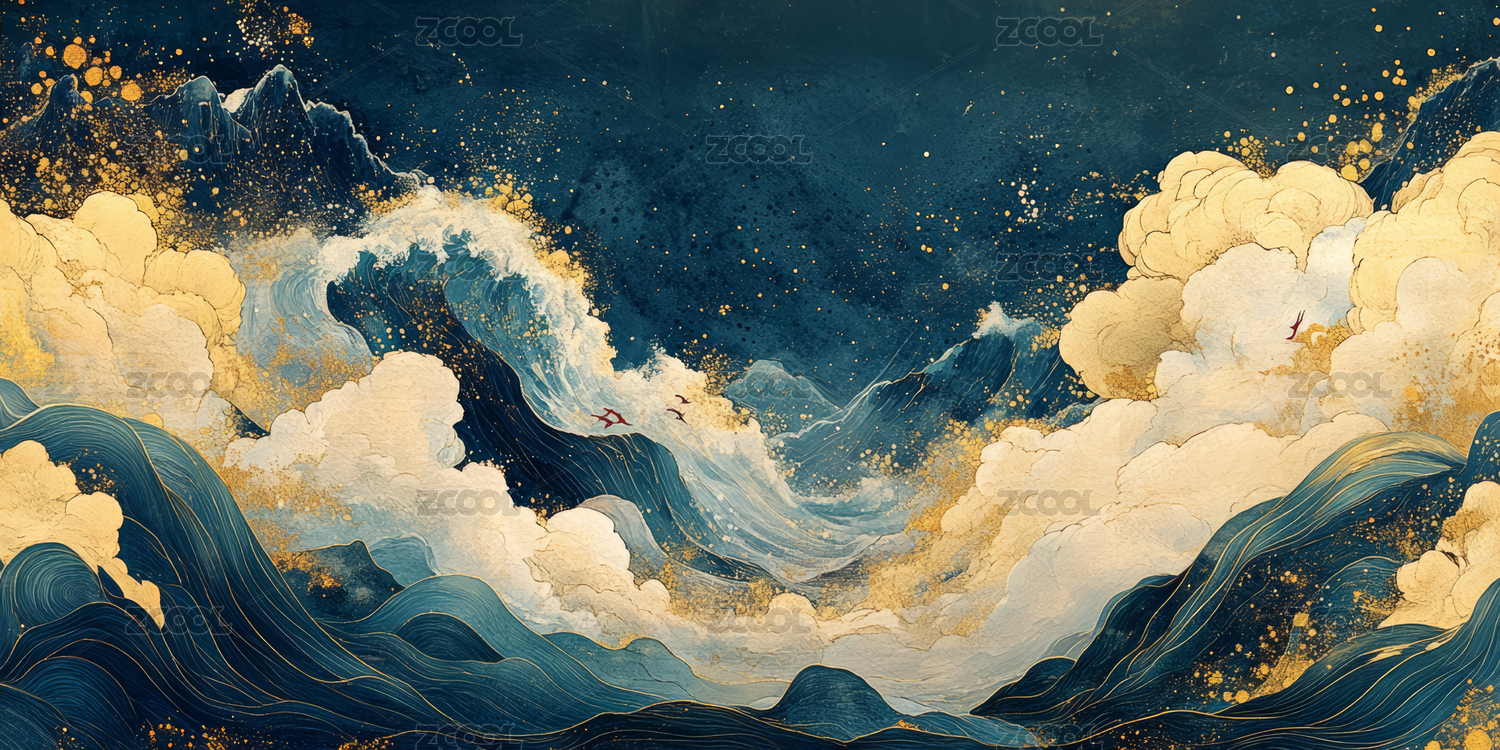 敦煌风格,金箔岩彩,青绿色,立体,丝绸,橙黄色,金色颗粒,山水画,电商背景