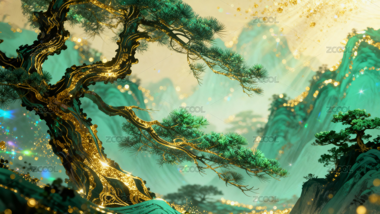 金箔,岩彩,松柏树,梦幻,电商,艺术,抽象,背景