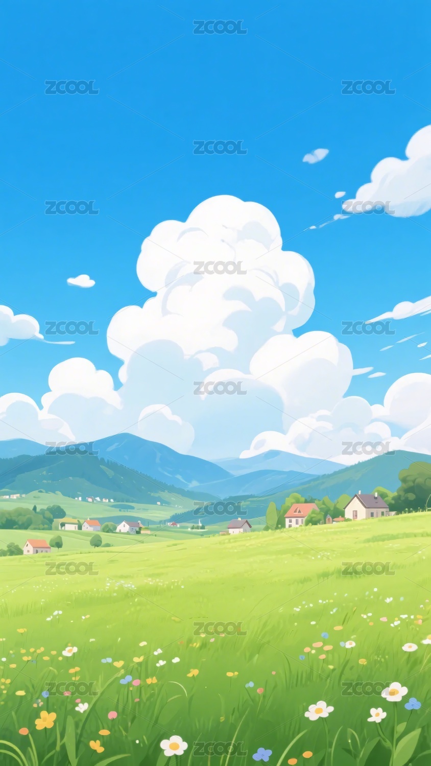 秋日田园蓝天云朵风景插画治愈背景素材