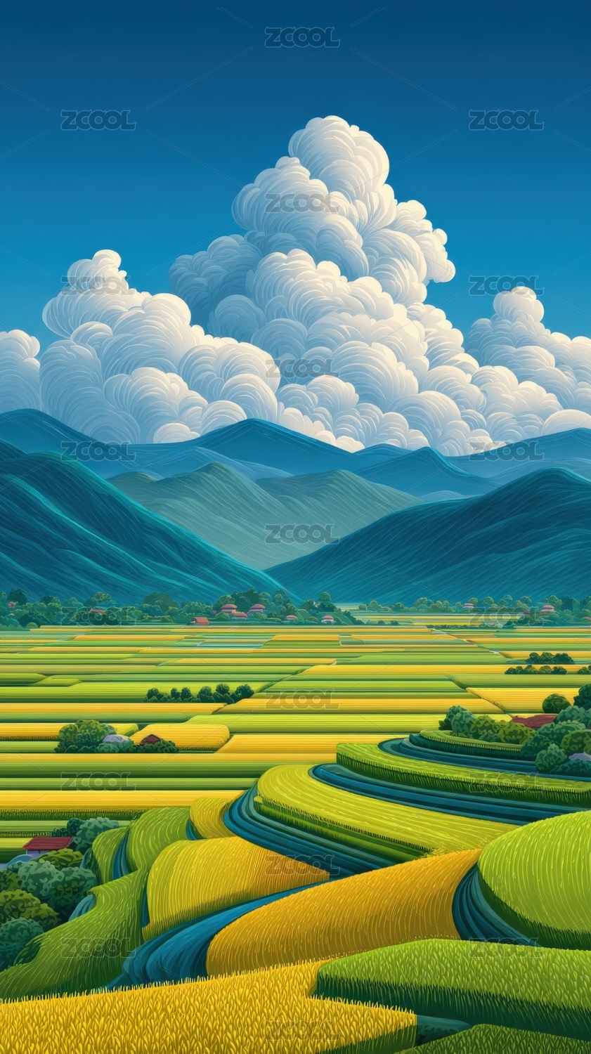 夏日山间田园风光插画
