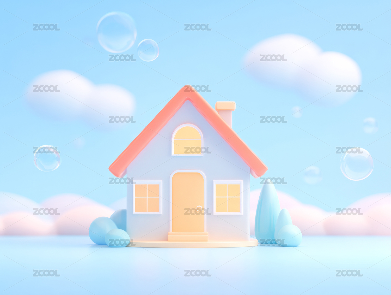 小屋,气球,树木,云朵,蓝天,简约,卡通,温馨,迷你,色彩