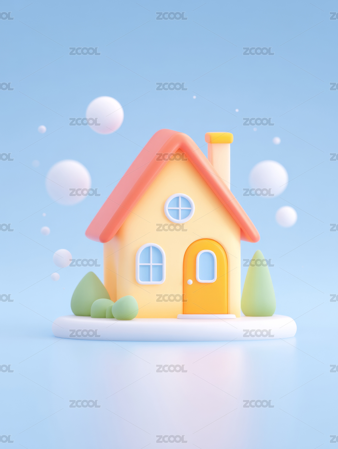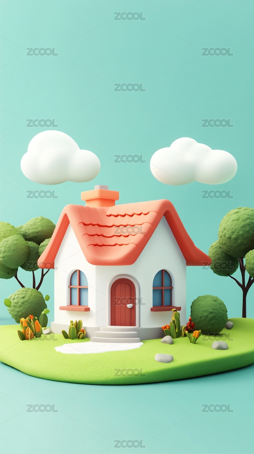 小屋,卡通,树木,云朵,蓝天,门窗,台阶,简约,色彩