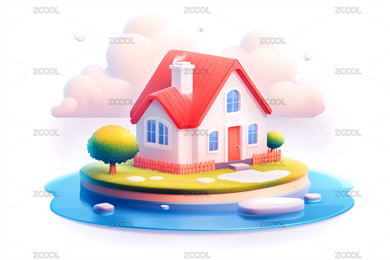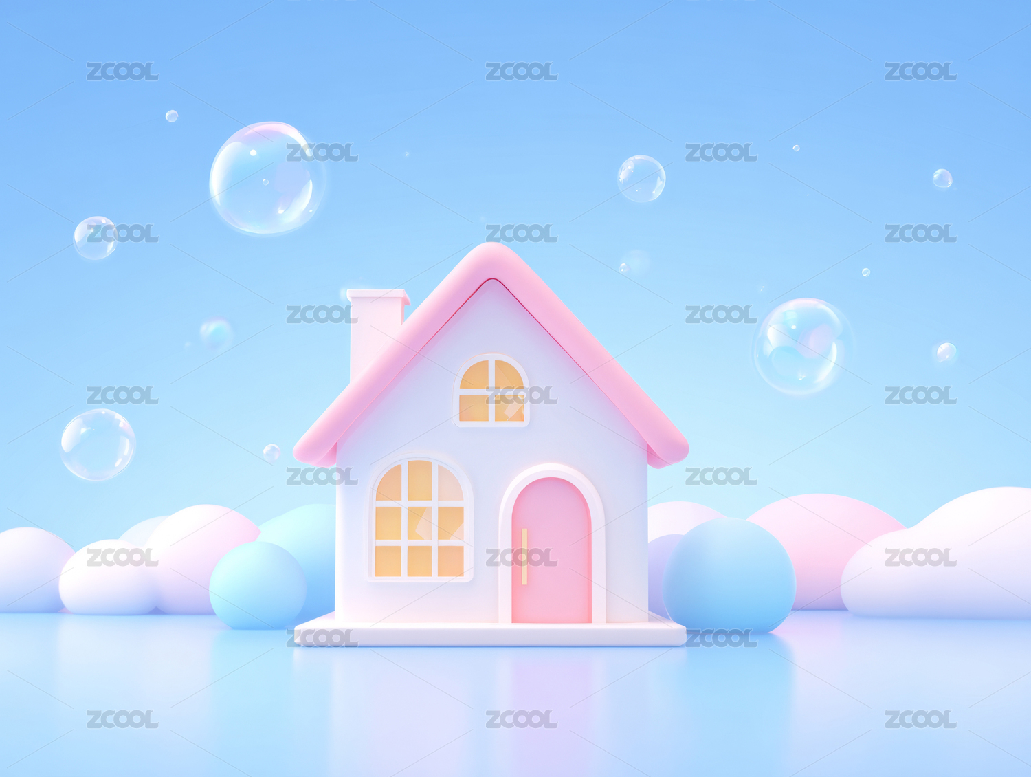 小屋,泡泡,温馨,卡通,蓝天,绿树,门窗,橙色,白云